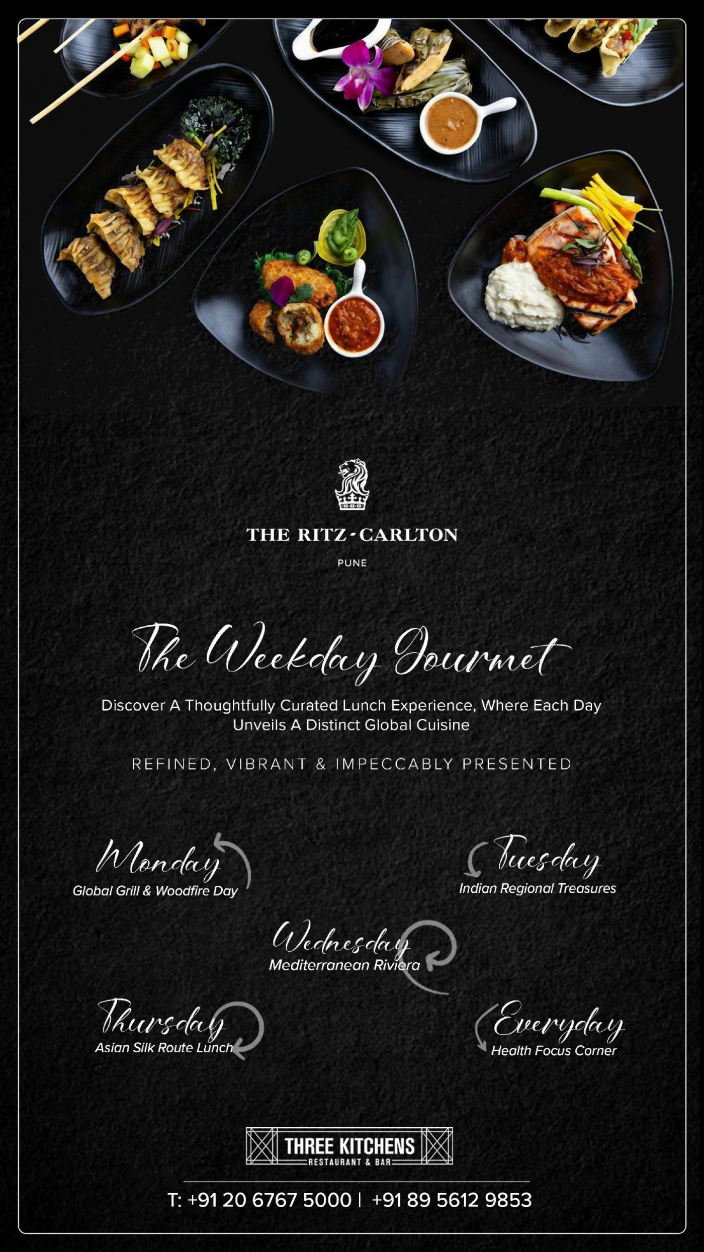 Embark on The Weekday Gourmet at Three Kitchens Restaurant & Bar, The Ritz-Carlton, Pune, a thoughtfully curated lunch experience where each day celebrates a distinct global cuisine. From Global Grill & Woodfire Mondays and Indian Regional Treasures Tuesdays to the vibrant flavours of the Mediterranean Riviera on Wednesdays and the aromatic journey of the Asian Silk Route on Thursdays, every afternoon promises refined, vibrant, and impeccably presented fare. Complemented by a dedicated Health Focus Corner available daily, this elevated weekday lunch is designed for discerning diners seeking variety, sophistication, and a world of flavours—all in one elegant setting.