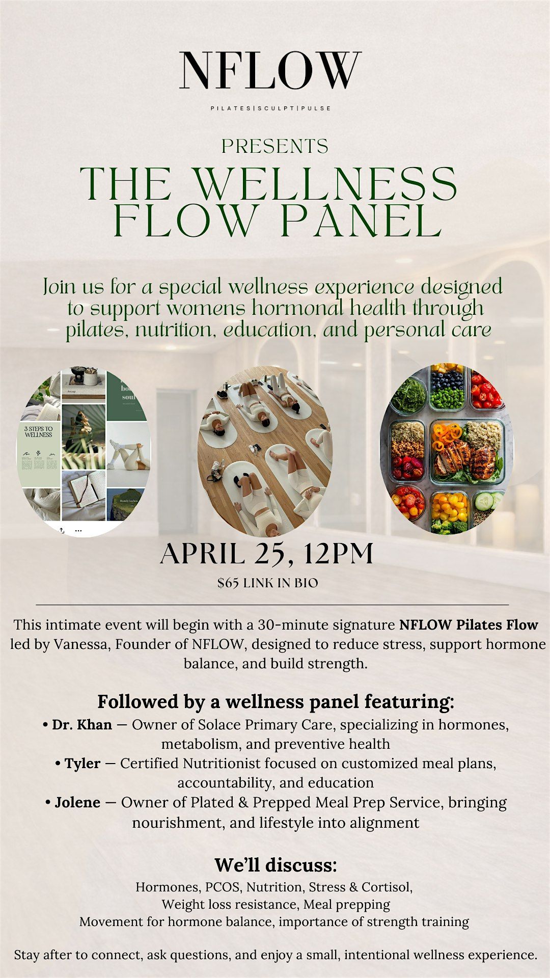 This intimate event will begin with a 30-minute signature NFLOW Pilates flow led by Vanessa, Founder of NFLOW, designed to reduce stress, support hormone balance, and build strength.