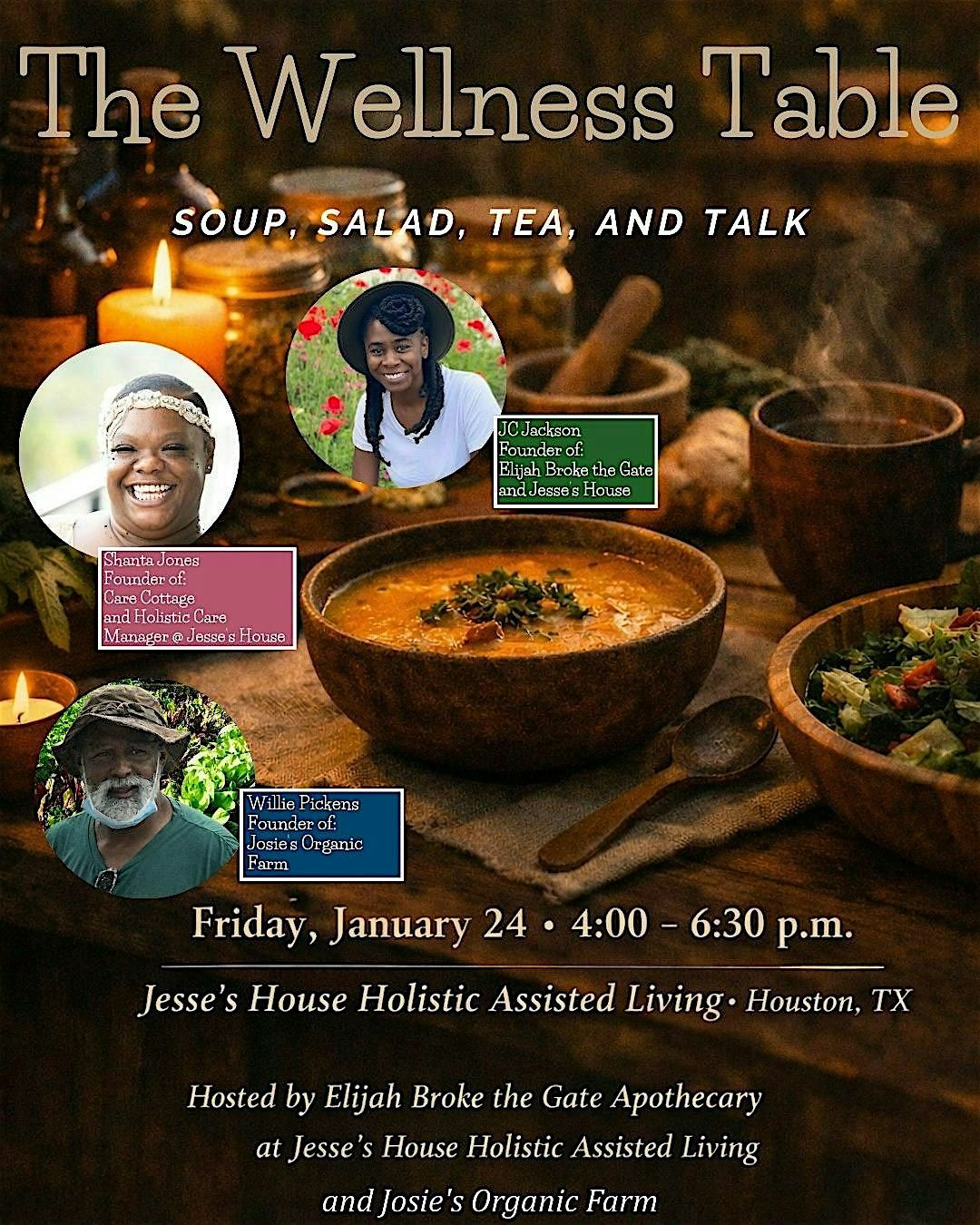 Nourish your body, calm your mind, and connect with community at The Wellness Table: a cozy, outdoor farm-to-table experience blending good food, herbs, and real conversation in Houston’s north side. Hosted at Jesse’s House: A Holistic Assisted Living Home, and featuring Elijah Broke the Gate Apothecary Division and Josie's Organic Farm. This evening is designed as a gentle reset for the new year.