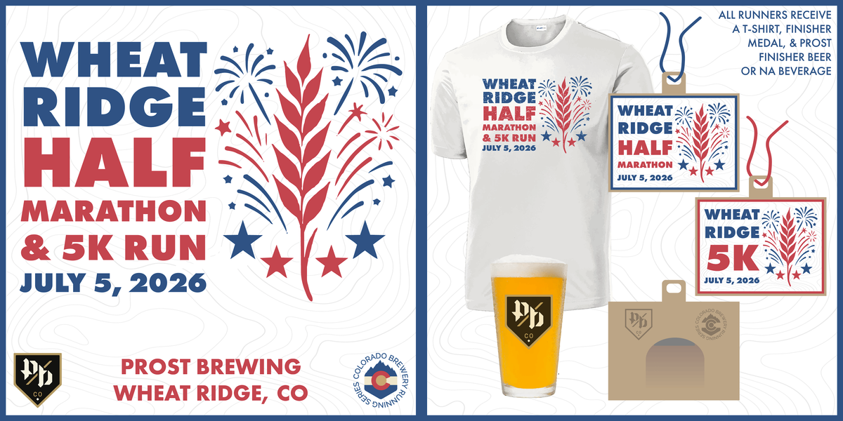 Join us for The Wheat Ridge Half Marathon and 5k on Sunday, July 5, 2026. The course starts and ends at Prost Brewing's newest location - in Wheat Ridge at Clear Creek Crossing (opening May 2026). The out-and-back course features a run that follows the Clear Creek Trail.