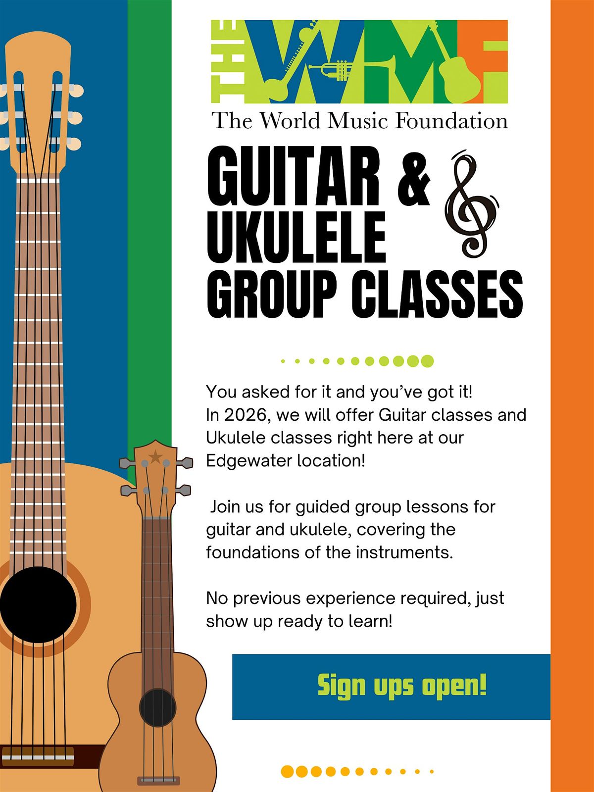 In 2026, we will offer Guitar classes and Ukulele classes right here at our Edgewater location! This first group class is free to attend. Learn more about our group, and private lessons here: http://theworldmusicfoundation.org/lessons/
