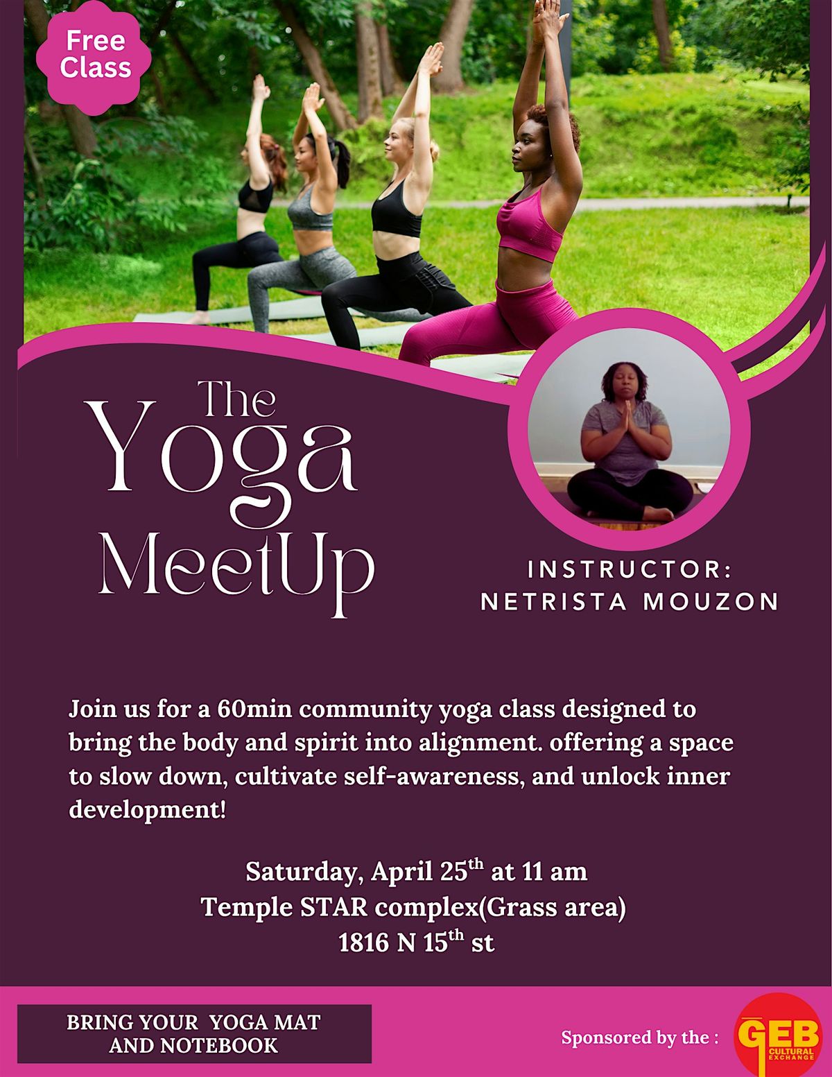 Join Yoga Instructor Netrista Mouzon in a 60min community yoga class designed to bring the body and spirit into alignment. offering a space to slow down, cultivate self-awareness, and unlock inner development!
