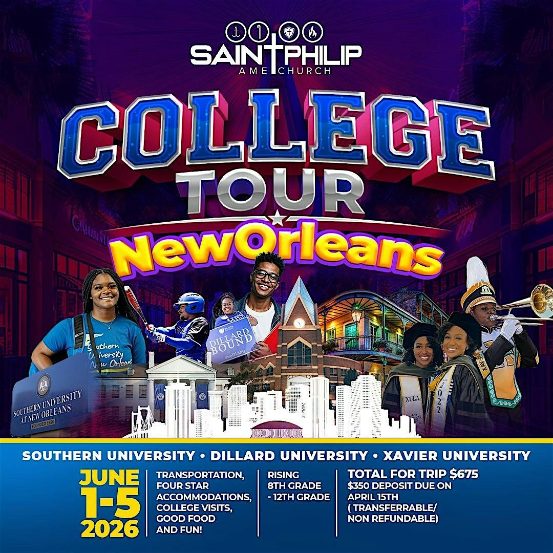 Join the youth experience at Saint Philip AME Church as we travel from June 1st to June 5th as we explore some of the coolest colleges in vibrant New Orleans. It's the perfect chance to check out campuses, soak up the city's unique vibe, and imagine your future in this amazing place. Don't miss out on this fun and informative trip!