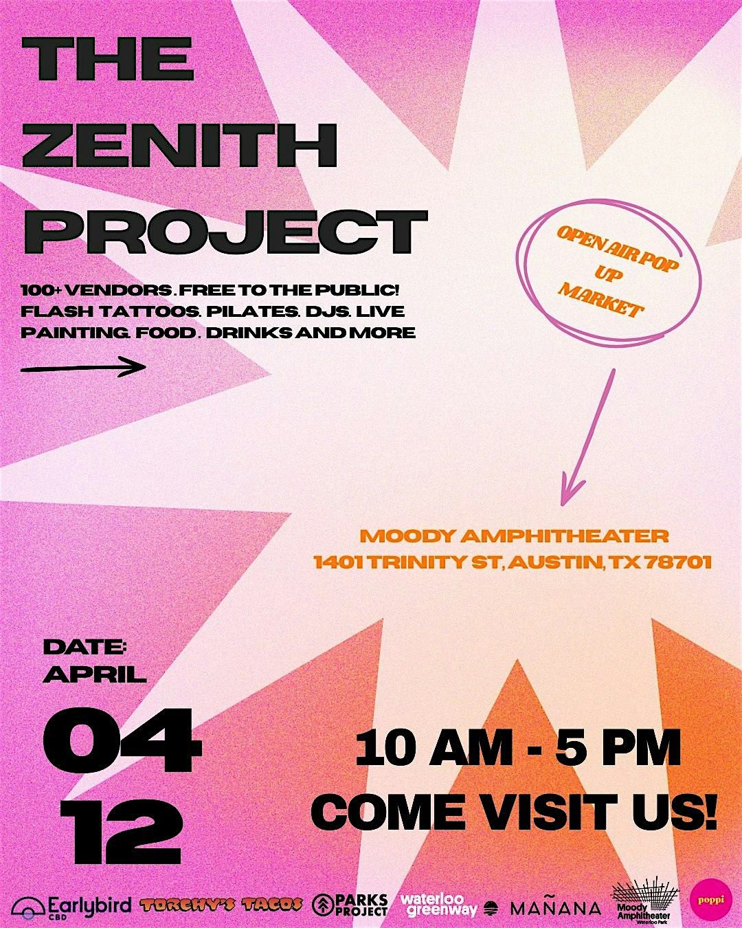 The Zenith Project is a curated, community-driven marketplace and experience that brings together Austin’s vibrant network of artists, creatives, and small businesses. Held on April 12th from 10 AM to 5 PM at the Moody Amphitheater, the event features over 100 local vendors alongside a full day of immersive programming.