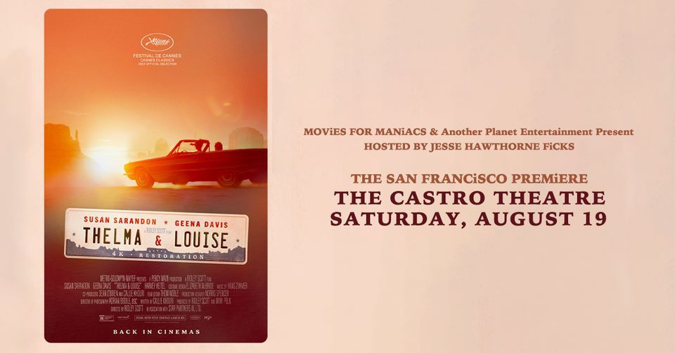 MOViES FOR MANiACS & Another Planet Entertainment present The San Francisco Premiere of THELMA & LOUiSE (4K RESTORATION), hosted by Jesse Hawthorne Ficks at the Castro Theatre on Saturday, August 19th, 2023. Directed by Ridley Scott from an Oscar®-winning screenplay by Callie Khouri, “Thelma & Louise” has been hailed as one of the best road movies of all time! Susan Sarandon and Geena Davis star as accidental outlaws on a desperate flight across the Southwest. With a determined detective (Harvey Keitel) on their trail, a sweet-talking hitchhiker (Brad Pitt) in their path and a string of crimes in their wake, their journey alternates between high-speed thrill ride and empowering personal odyssey.