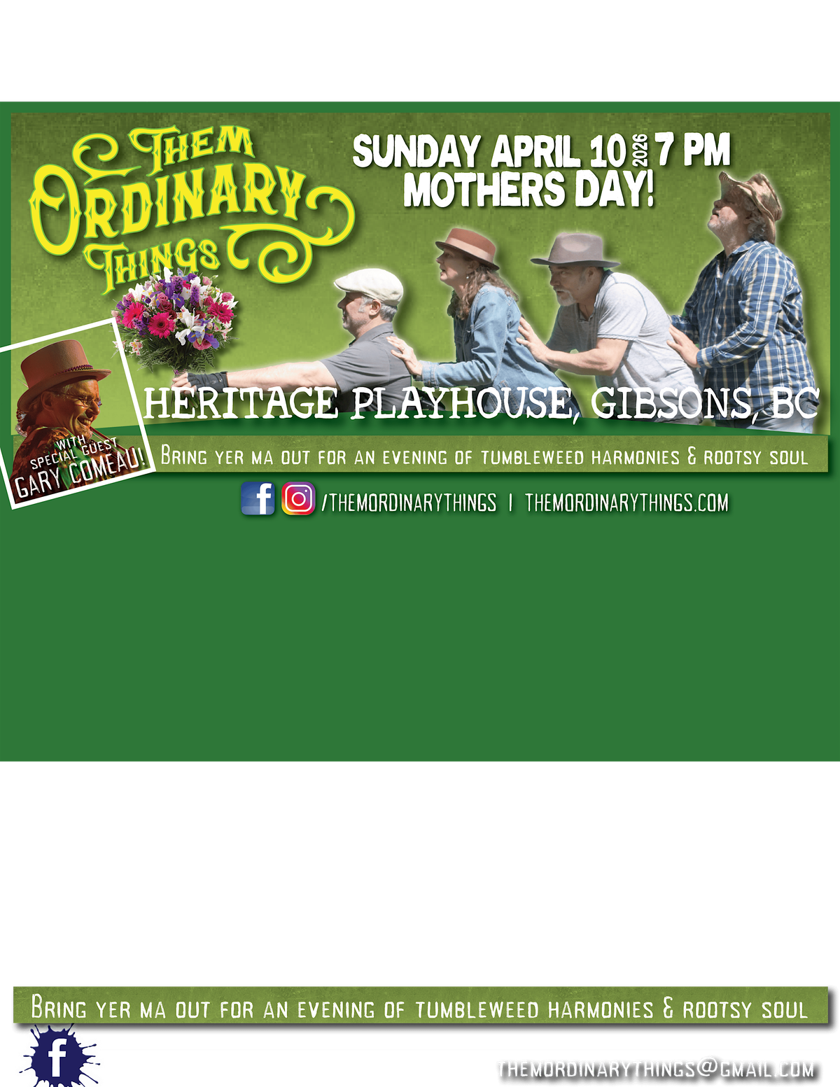 Them Ordinary Things are excited to share their new material (along with favourites from the past) in the comfort of Gibsons' beautiful Playhouse! A dollar from every ticket goes toward restoring this lovely and important venue.
