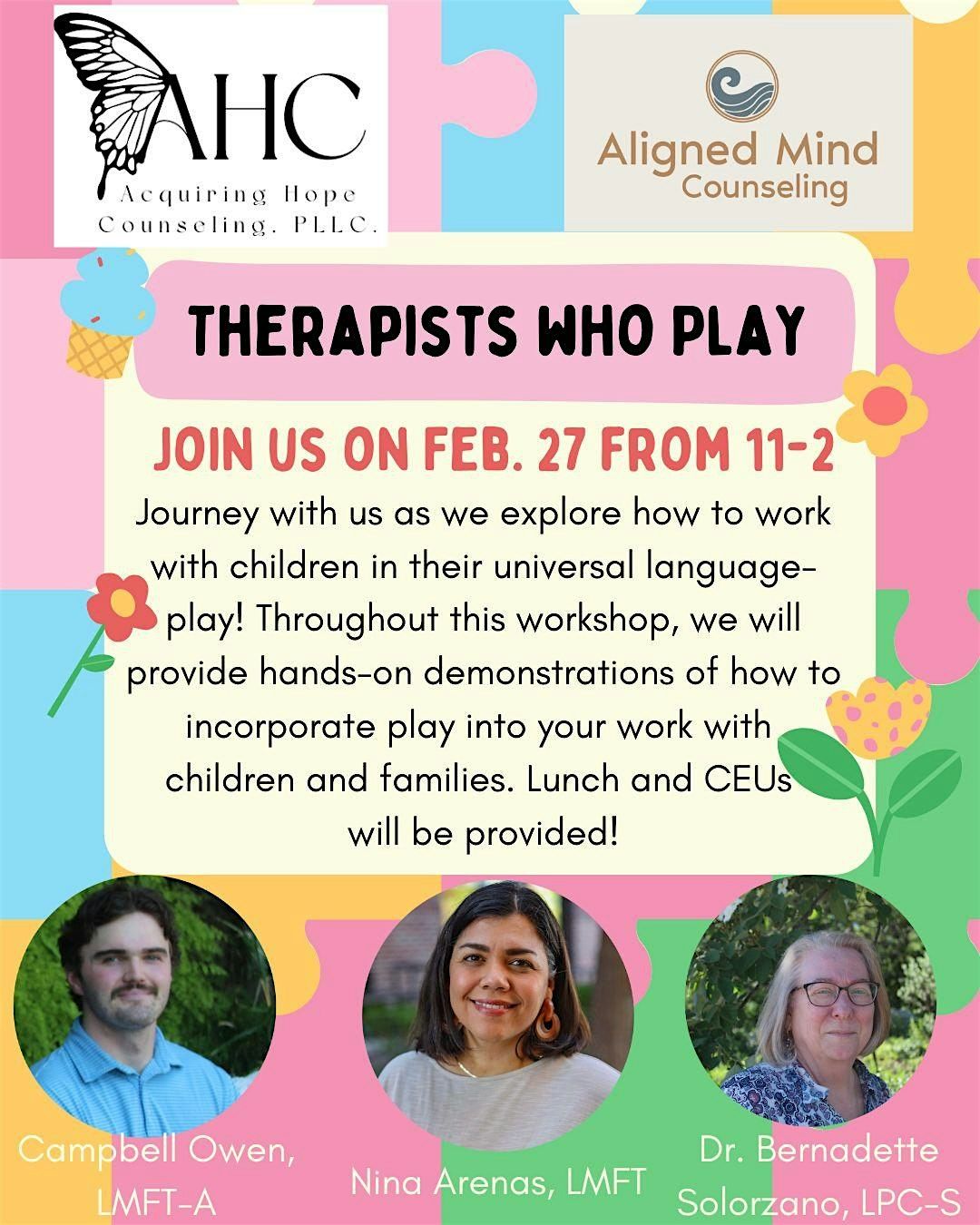 Come join Acquiring Hope Counseling and Aligned Mind Counseling at 1635 NE Interstate 410 Loop on February 27, 2026 at 11:00 AM (Central Time) for a fun-filled event where therapists will learn how to be more comfortable incorporating play into their work. It's a great opportunity to relax, have fun, and connect with fellow therapists who are passionate about working with children and families.