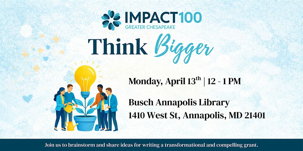 Join Impact100 Greater Chesapeake for an inspiring Lunch & Learn at our "Think Bigger" gathering, where visionary ideas meet practical strategies. This is your chance to connect with Impact100 Greater Chesapeake members, past grant recipients, and fellow changemakers eager to elevate their impact!