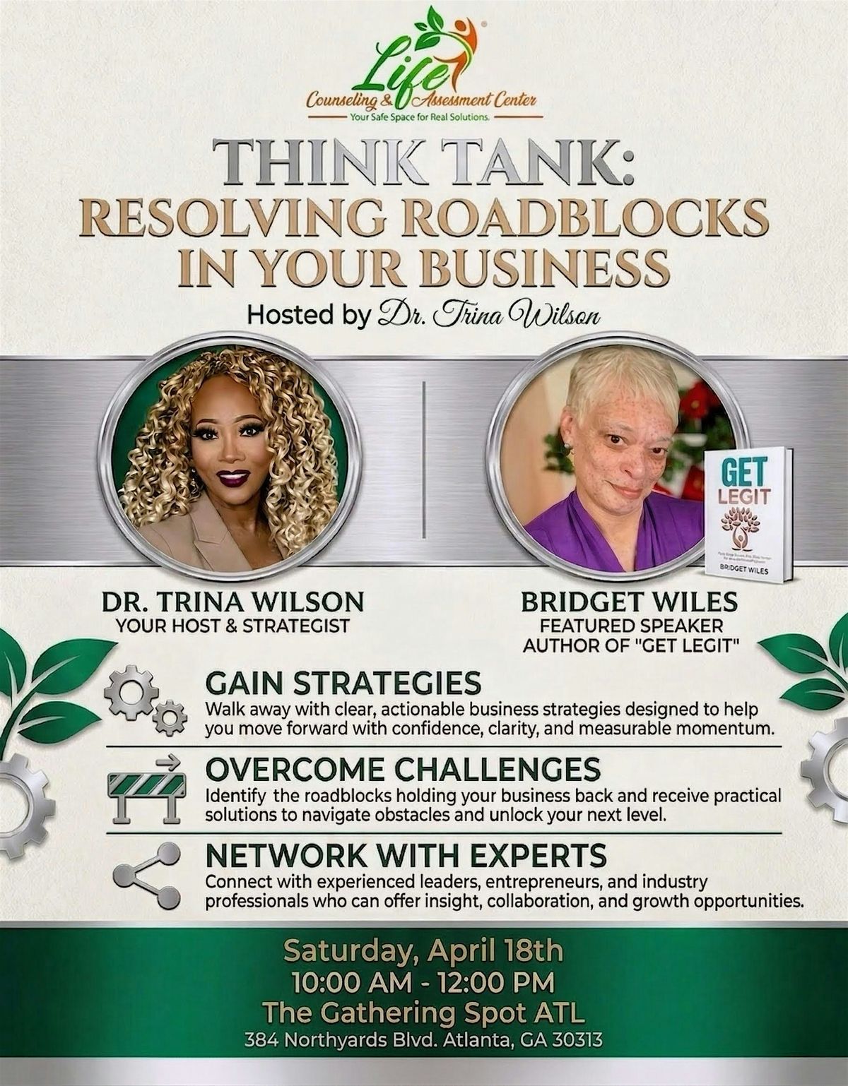 Hosted by Dr. Trina Wilson, this professional "Think Tank" features guest speaker and business strategy expert Bridget Wiles. Using the powerful, proven principles found in her popular book, "GET LEGIT," Bridget will lead an immersive session focused on moving beyond theories and diving into practical, real-world execution.