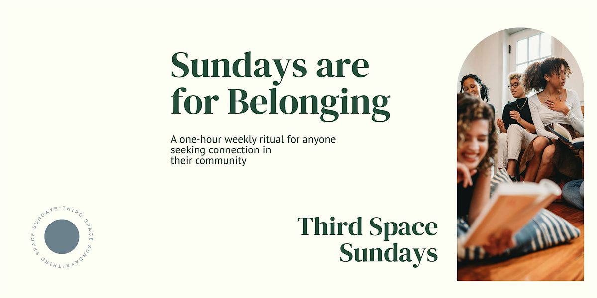 Third Space Sundays is a weekly, one-hour gathering rooted in two core values: belonging and reciprocity. Itβs for anyone who wants to feel connected without networking, pressure to perform, or the intensity of self-improvement spaces.