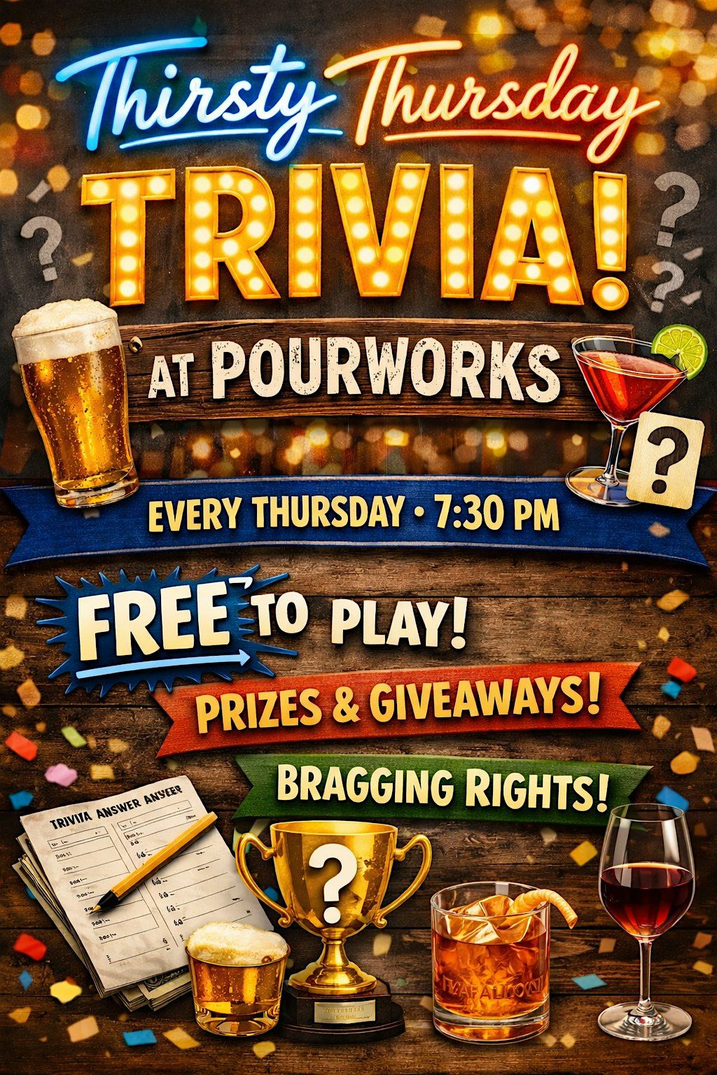 Join us for Trivia Night every Thursday at Pourworks! Compete for prizes and bragging rights! Tell your friends, tell your family, tell everyone! Doors open at 4pm, Thirsty Thursday Trivia starts at 7:30pm. Arrive early to grab your table and enjoy some terrific cocktails, craft beer, wine or cider!