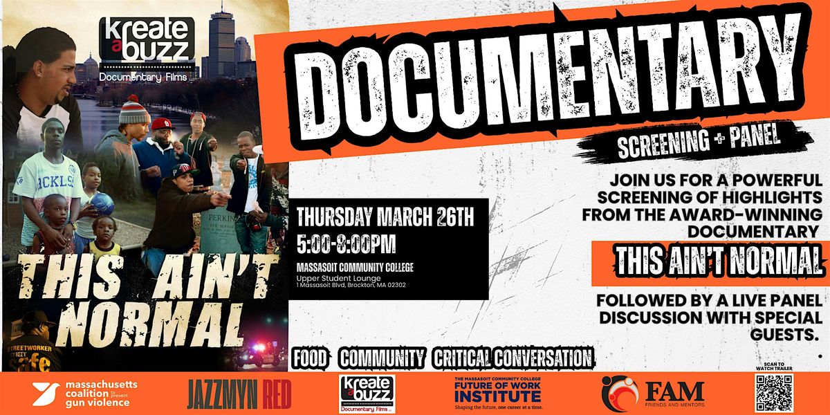 Join us on March 26th for a special screening of the Emmy-nominated documentary This Ain't Normal, a film focused on violence, its impact on youth and the outreach workers who intervene every day. This will be followed by a powerful panel discussion about the importance of violence prevention from community leaders in Brockton. Don't miss the opportunity to stay engaged with those doing meaningful gun violence prevention work!
