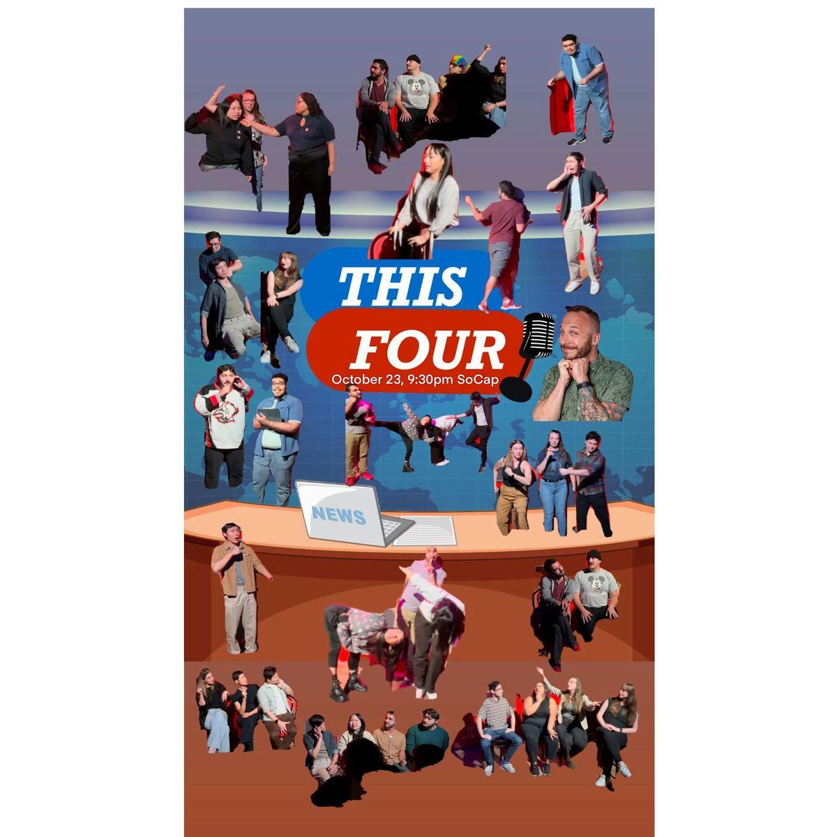 Tired of dreary headlines in the news? This Four has got you covered! This October 23rd, 9:30pm at SoCap Comedy (The Social Capital Theatre) watch as this troupe of talented Toronto improvisers take headlines and events supplied by you, the audience, and give our comedic takes on it. If you're a fan of improv, comedy shows, or just want some good news This Four is who you need to see!