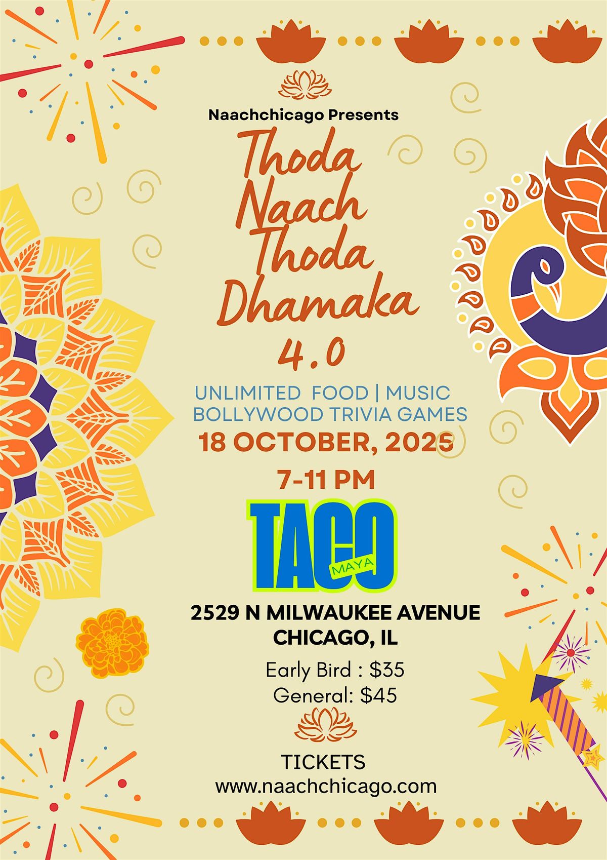 Get ready to groove and set the stage on fire at the most electrifying event of the year - THODA NAACH THODA DHAMAKA! Join us on Saturday, October 18th, 2025 at 7:00pm (CDT) for an unforgettable experience filled with non-stop music, dance, and entertainment.
