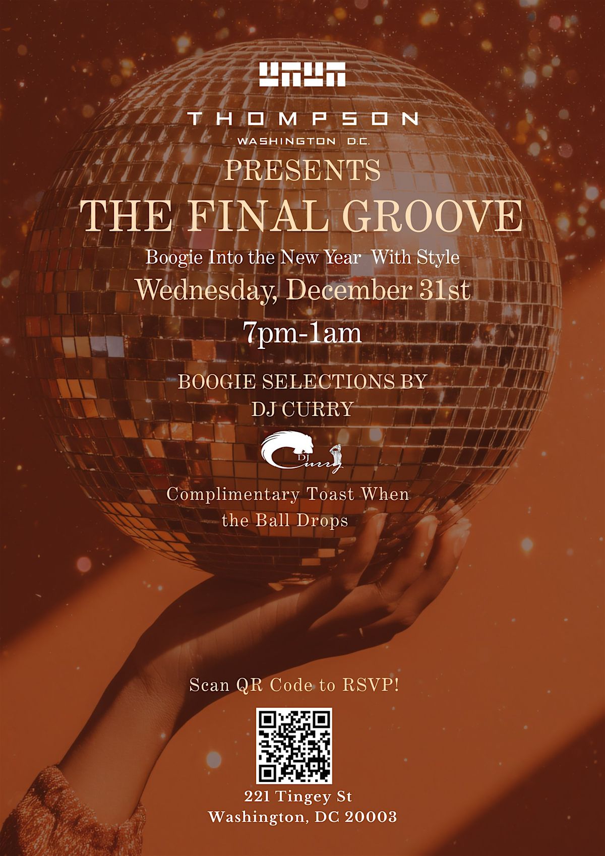 Thompson DC invites you to step inside a shimmering, Studio 54–inspired celebration designed to send 2025 off in style. Join us for The Final Groove, our signature New Year’s Eve experience filled with golden glamour, disco energy, and the unmistakable cool of Thompson DC.