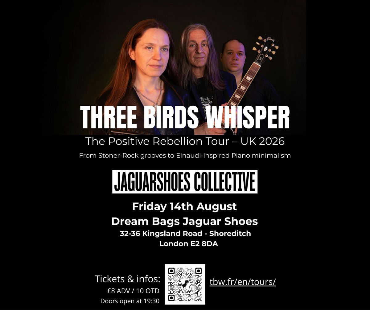 Three Birds Whisper - Live at Dream Bags Jaguar Shoes London - The Positive Rebellion Tour UK 2026 - Friday August 14th 2026 - Doors: 7:30pm | Music starts: 8:00pm