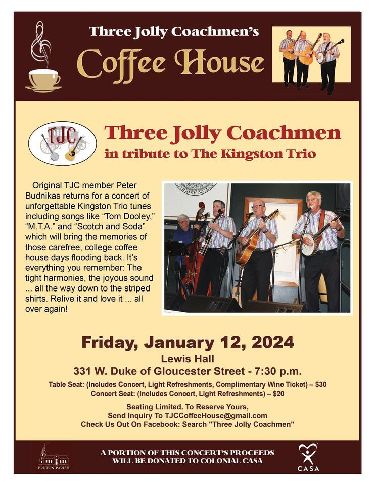 The support and enthusiasm of Three Jolly Coachmen's Coffee House supporters is positively mind-blowing: Two days after first announcing the Three Jolly Coachmen's next performance on Friday, Jan. 12, all Table Seats have SOLD OUT. We can't tell you how grateful we are for your ongoing support of our concert series. There are still Concert Seats ($20, all refreshment included) remaining, but they are also going fast. If you'd like to order a Concert Seat, click on the link below:https://swipesimple.com/links/lnk_f74cd618