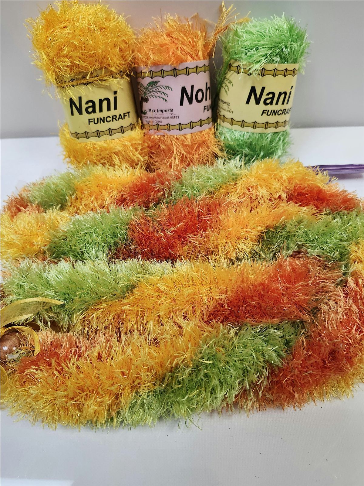 A three-straw twisted lei is created byweaving yarn around three straws to form a, often, 24- to 30-inch long, fluffy, and full-looking, but lightweight lei. Using bubble tea/smoothie straws, grosgrain ribbon, and fuzzy or eyelash yarn, the technique involves tying yarn to the base of the straws and weaving figure-eights, pulling the resulting yarn down as it is created, and finally twisting or knotting to achieve the desired, often, 3D effect.