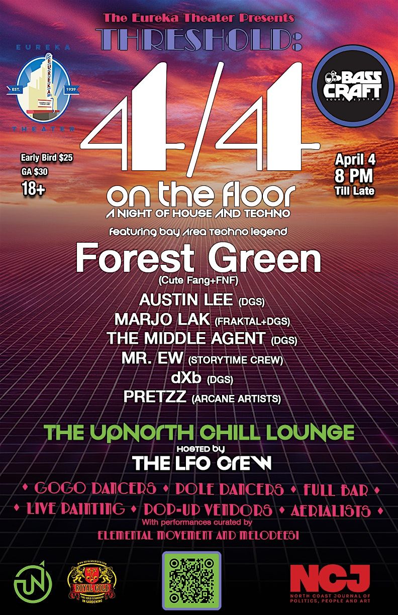 Our headliner is an underground techno legend from San Francisco, Forest Green, with support from Humboldt’s favorites Austin Lee, The Middle Agent, Marjo Lak, Mr. EW, Pretzz, dXb- fka Dub Cowboy and the LFO Residents.