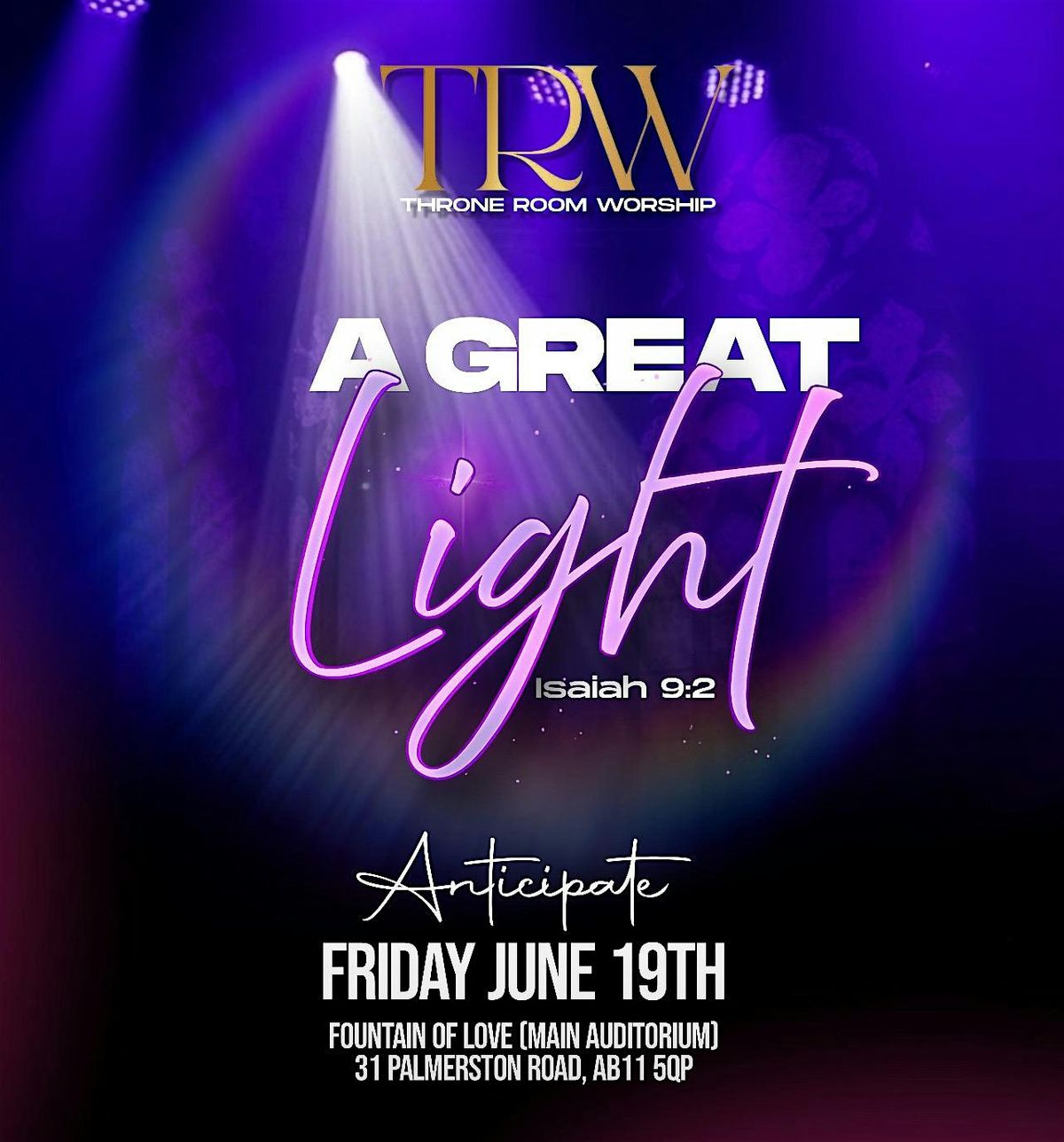 TRW presents A Great Light. Expect an atmosphere of raw worship, a room full of hunger and an evening where heaven meets earth! Register now