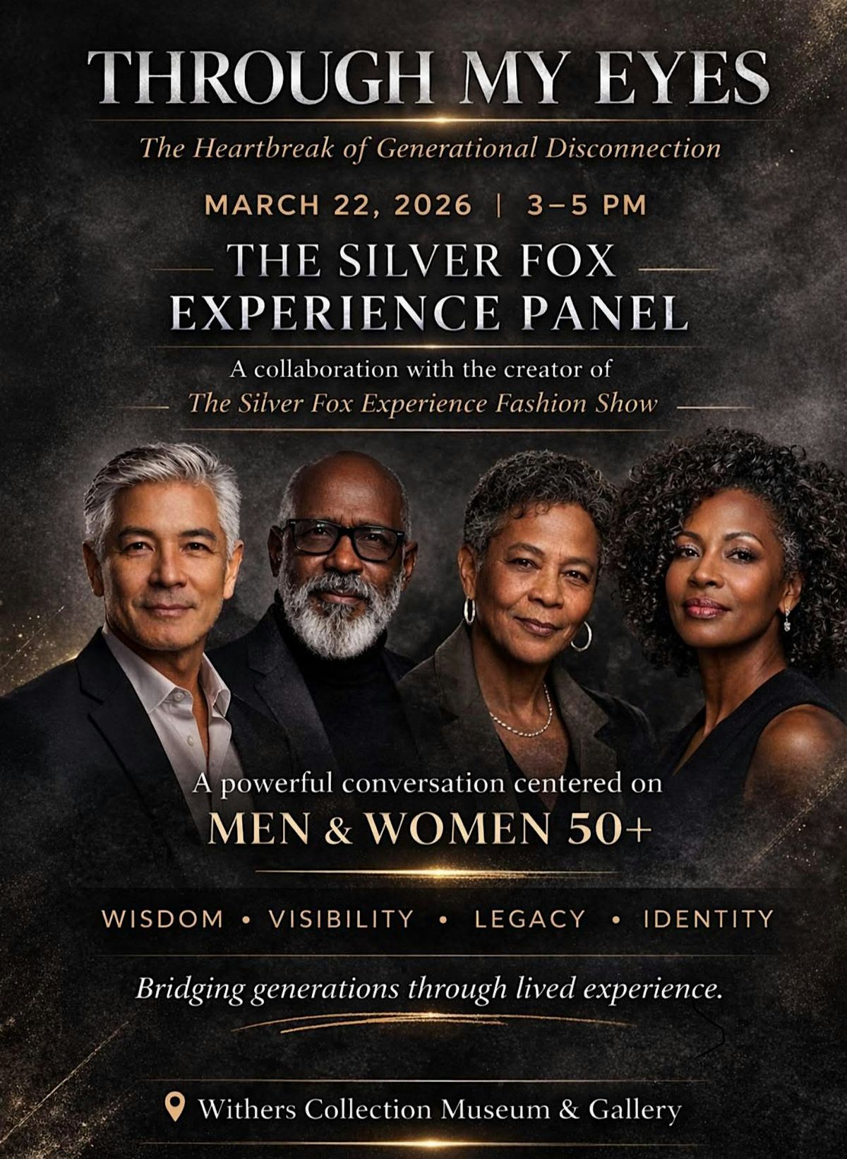 This panel discussion is part of the Silver Fox Experience series, in collaboration with Through My Eyes: The Heartbreak of Generational Disconnection. Featuring distinguished voices age 50 and up, the conversation explores the wisdom, experiences, and perspectives of seasoned individuals, while addressing the challenges of generational disconnection — how we communicate, respect, and relate across age groups.