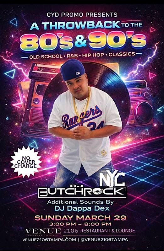 80s & 90s Throwback Party DJ Butchrock NYC & DJ Dappa Dex spinning old school R&B, hip hop & classics. Sun Mar 29 • 3–8PM • Venue 2106 •