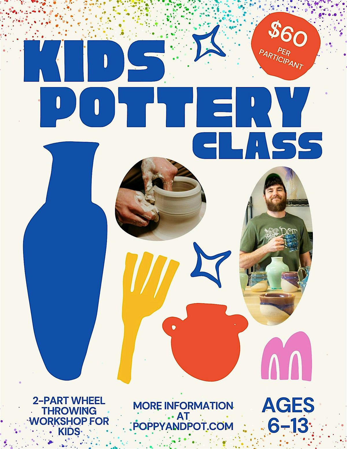 Poppy + Pot’s Lead Potter, Kevin Reichenberg, has created a child friendly approach to making pottery on the wheel. This is a two-part workshop! You’ll bring your child for part-one where they'll make a bowl on the wheel and then return on a later date to glaze their piece. At the end of this workshop, each student will have made their very own piece of art that makes the perfect gift!