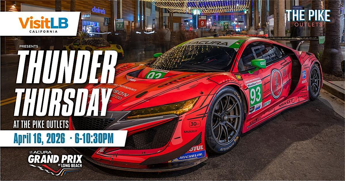Thunder Thursday presented by Visit Long Beach will be back on April 16th from 6-10:30PM at The Pike Outlets! Bring the whole family to enjoy a FREE action-packed night beginning with Acura Grand Prix of Long Beach race car display. Thunder Thursday kicks off the Grand Prix weekend with endless activities, racing, live music, cars, bikes and everything you could want!