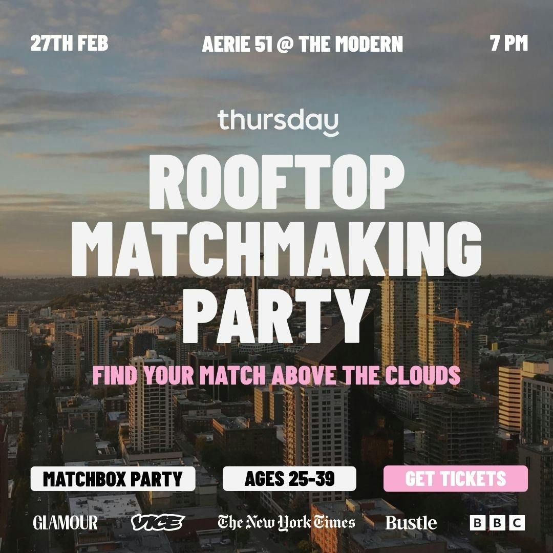 Ages 25–39 Matchmaking Rooftop PartyThursday Seattle is teaming up with Matchbox for a celestial-inspired rooftop singles night at Aerie 51 at The Modern. The best rooftop in the city. Skyline views. DJs. Great drinks. A room full of singles who actually came to meet someone.
