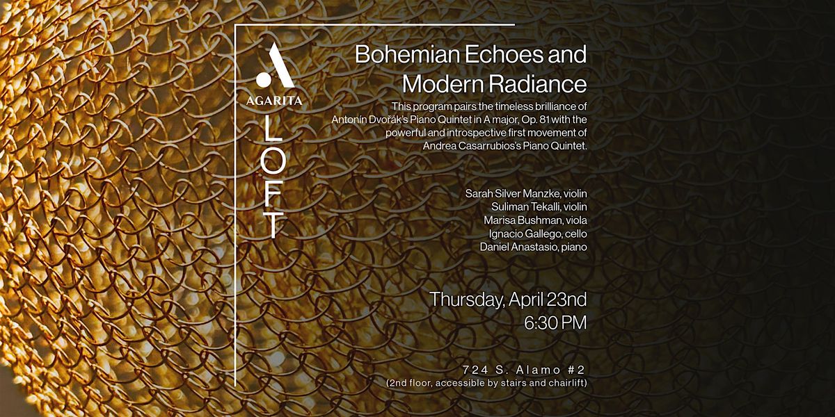 Experience the piano quintet as a living, evolving art form. This program pairs the timeless brilliance of Antonín Dvořák’s Piano Quintet in A major, Op. 81—bursting with Bohemian spirit and unforgettable melodies, with the powerful and introspective first movement of Andrea Casarrubios’s Piano Quintet.