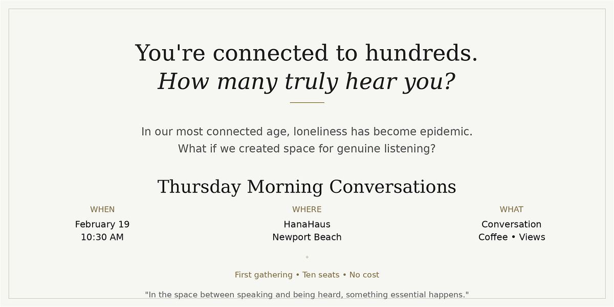 Ten people. Coffee. A question to begin. Then we follow where honest conversation leads— without agenda, without performing, without the pressure to solve or fix.