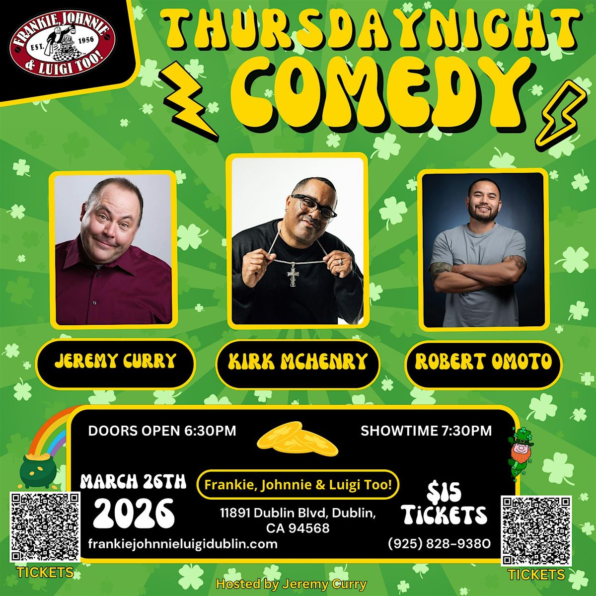 Get ready to laugh your socks off in person this Thursday night at Frankie, Johnnie, & Luigi's! Join us for an unforgettable evening full of jokes, good vibes, and great company. Starring KIRK MCHENRY & featuring ROBERT OMOTO! Whether you're coming with friends or flying solo, the comedy's gonna be on point. Don’t miss out on the fun—see you there!
