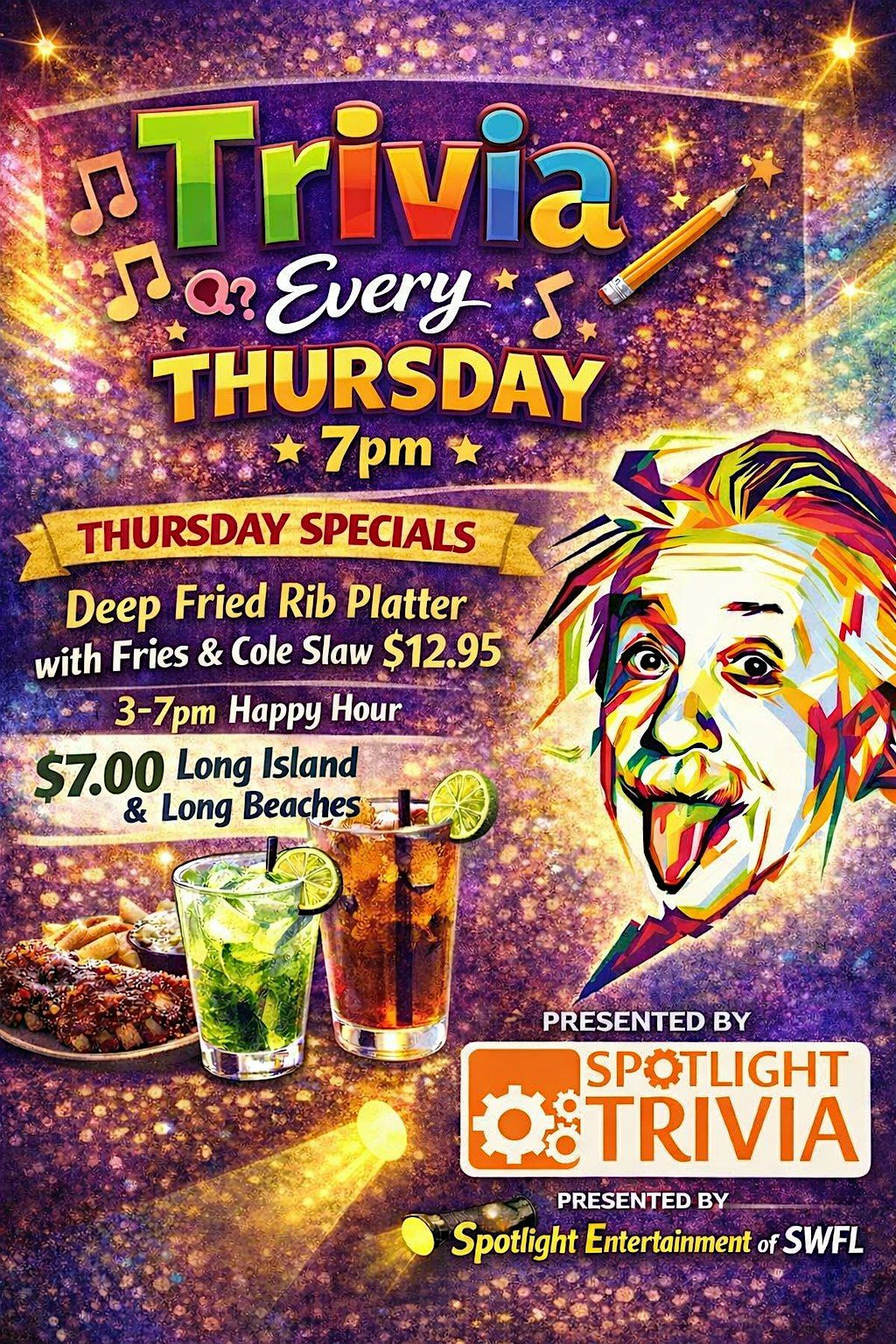 Grab your friends and join us every Thursday for Spotlight Trivia! Test your knowledge and speed while competing for great prizes. Every round has a winner and, as always, the game is FREE to play! Will your team win?? !Hosted by Spotlight Entertainment of SWFL