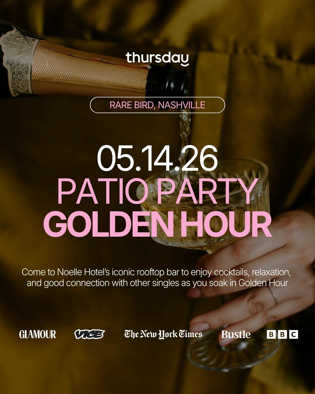 The view is the only icebreaker you’ll need 🌆On May 14th from 7–10pm, we’re heading up to Rare Bird, the rooftop at Noelle, for Patio Party, Golden Hour. An event centered around the ultimate Nashville golden hour ☀️ This one is for our 30+ singles who appreciate a relaxing drink and watching the sunset. We’re going back to basics. No games, no forced rotations—just a warm, slow-paced evening for fifty people looking for someone to enjoy the sunset with. 🍸✨