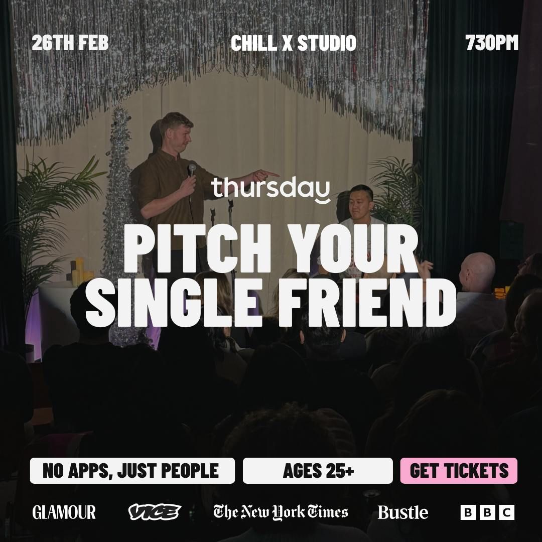 Just a comedy club, everyone single. Because the world in 2026 is all about meeting IRL, not on dating apps!Singles… after popular demand we are BACK at Chill X Studio for our second installment of Pitch Your Friend! Line up your biggest cheerleaders, trust us, you'll need them.