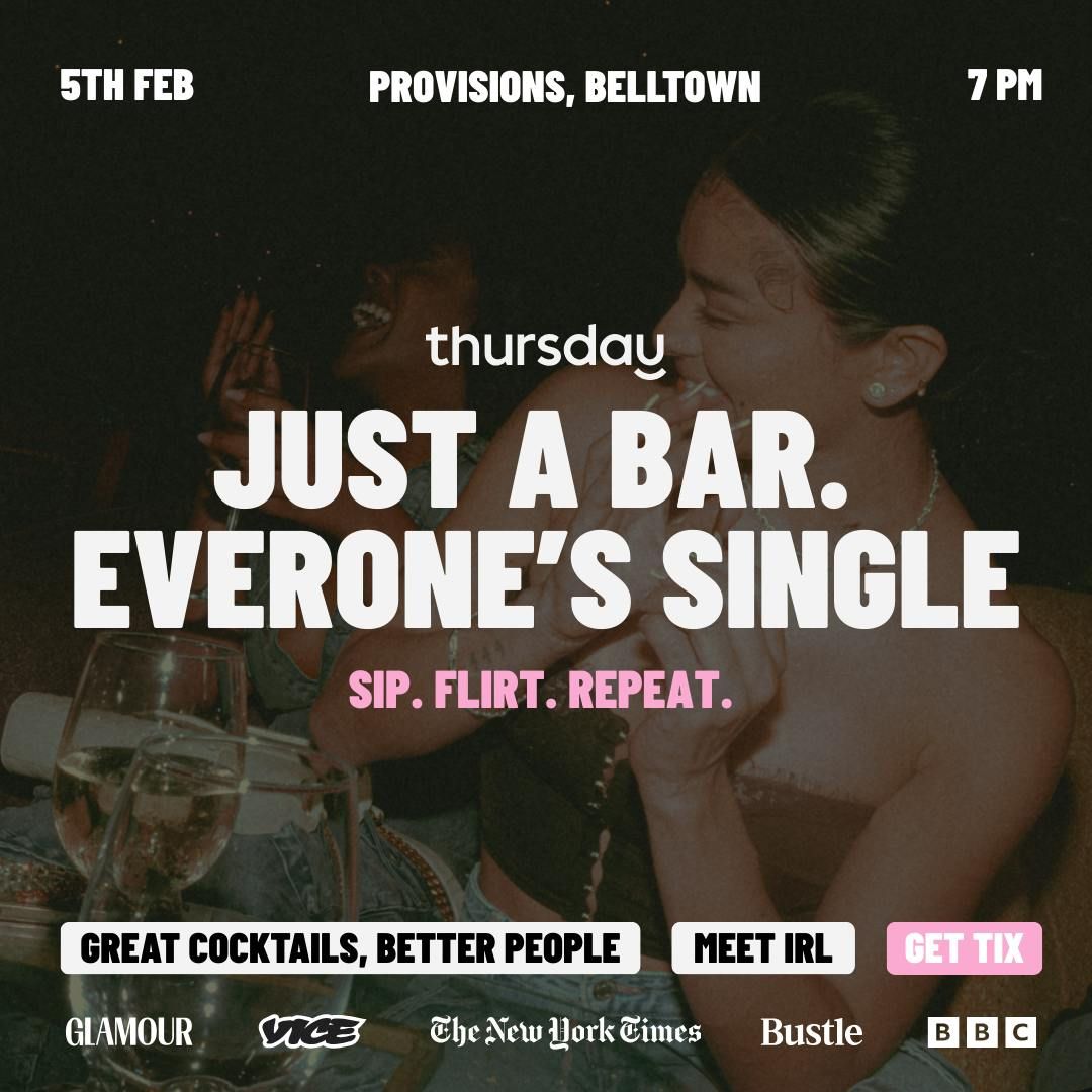 Just a bar, everyone single. Because the world in 2025 is all about meeting IRL, not on dating apps!We’re taking over Provisions, one of Belltown’s best bars, and filling it with cute single people who are actually here to meet someone. Drinks will be flowing, the room will be buzzing, and you never have to wonder if the person next to you is single. They are.