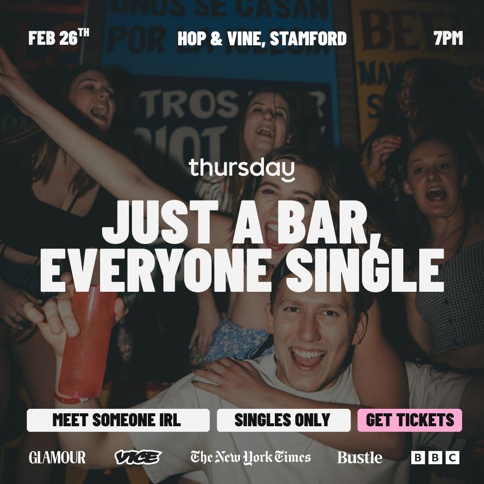 Just a bar, everyone single. Because the world in 2026 is all about meeting IRL, not on dating apps!We are back at both a beloved Stamford and Thursday favorite: Hop & Vine for a classic singles takeover of the top floor. No swiping, no awkward speed dates, just real people, handcrafted cocktails, and potential chemistry.