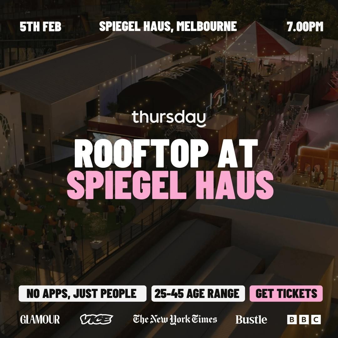 ๐ฅ Thursday Dating Rooftop Takeover at Spiegel Haus ๐ฅMelbourne, weโre going up. On Feb 5 weโre taking over Spiegel Haus, the rooftop playground perched above the CBD on Lonsdale Street, right near Chinatown. Skyline views, balmy summer air, and a room full of singles who actually came to meet someone.