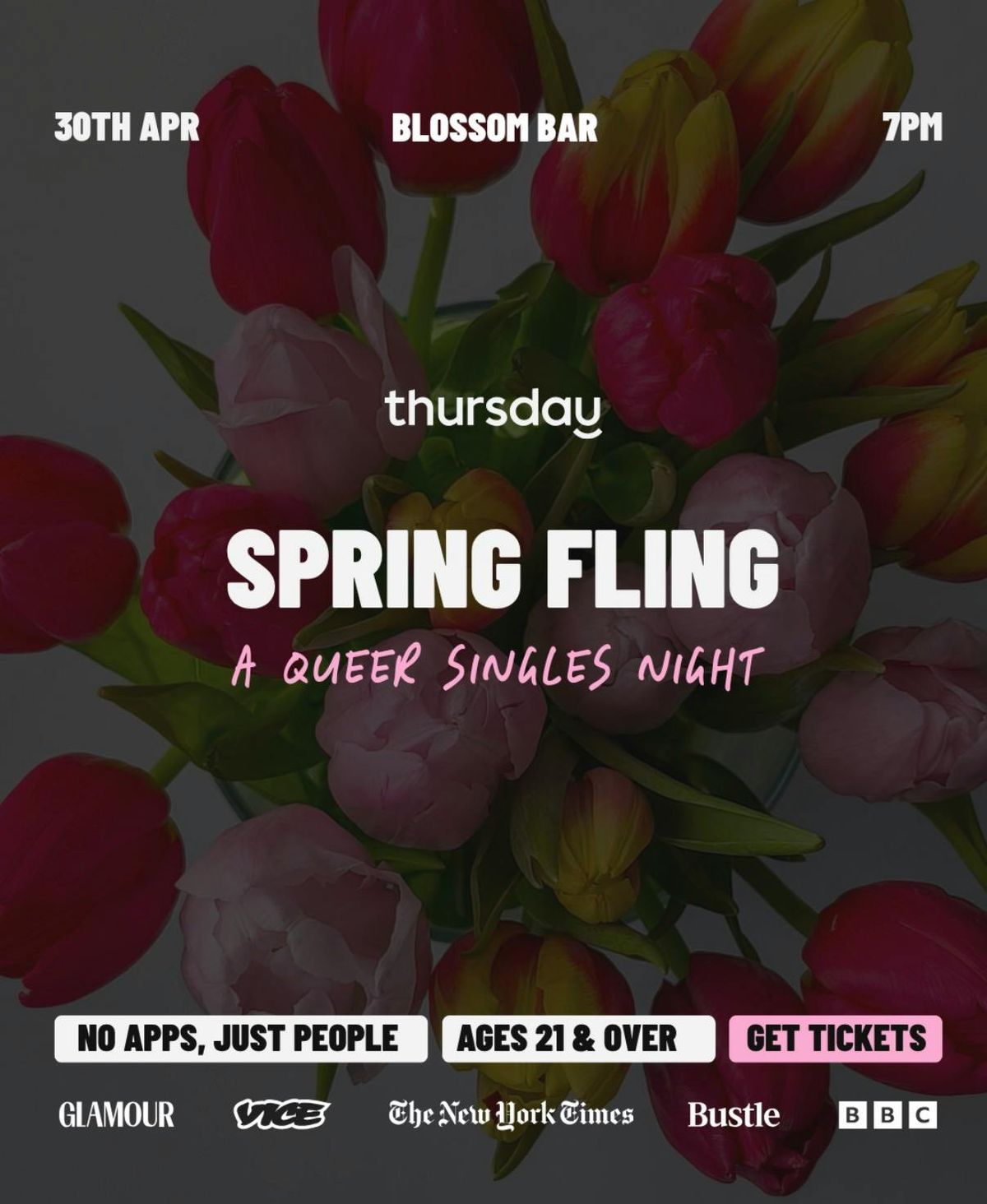 Queer love is in bloom at Blossom Bar🌸 Join us on April 30th at Blossom Bar! This event is BYOB. One venue. Everyone single. No swiping, no ghosting, just real humans in real life. Sparks highly likely.