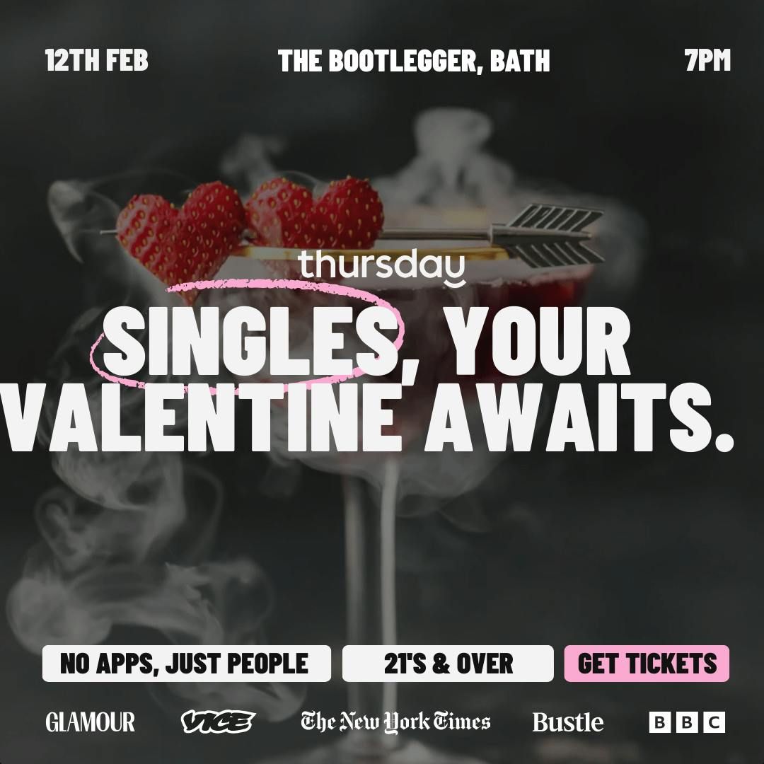 Just a bar, everyone single. Because the world in 2025 is all about meeting IRL, not on dating apps!Hello Bath! It's always a delight to see you, the gorgeous Thursday singles are heading back to The Bootlegger on the 12th of February for a romantic fun-filled evening!