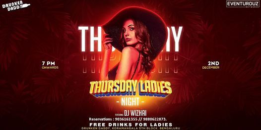 Experience an Absolute ''Thursday Ladies Night '' (Free drinks for ladies).Ft. DJ Wizhai Spinning the Best of Music, will turn your average Thursday evening into something wild and wacky. Join us at the hottest party in town.Venue : Drunken daddy koramangala.
