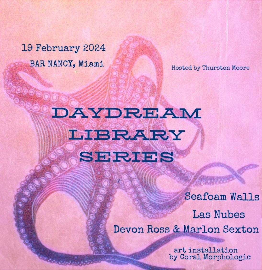 THURSTON MOORE hosts a very special evening with a showcase of his indie record label at BAR NANCY with live sets by Daydream Library Series artists including new signee DEVON ROSS who will be joined by MARLON SEXTON for an epic guitar duo, a set by Miami's Jayan Bertrand of SEAFOAM WALLS, as well as Miami quartet LAS NUBES who just released their latest 7inch on Daydream.