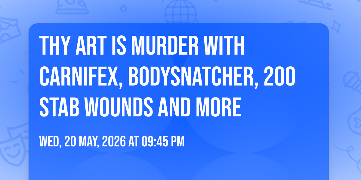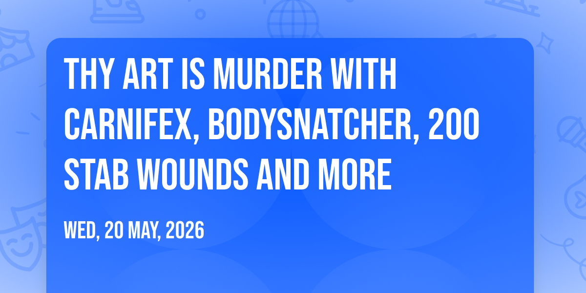 π Location: 41.5852, -93.7064β¨ Discover the extraordinary at Thy Art Is Murder with Carnifex, Bodysnatcher, 200 Stab Wounds and more, where magic meets reality in ways you've never imagined! ποΈ Set in Val Air Ballroom nestled in bustling West Des Moines, IA, this event promises to be a landmark occasion. π Taking place on May 20th, 2026 at 09:45 PM, it's going to create an atmosphere where every moment becomes a cherished memory. π Immerse yourself in an experience crafted with attention to every detail, designed to surprise and delight at every turn. They have worked tirelessly to ensure this event exceeds all expectations, bringing together elements of entertainment, innovation, and pure joy. π Don't miss your chance to be part of this remarkable journey!