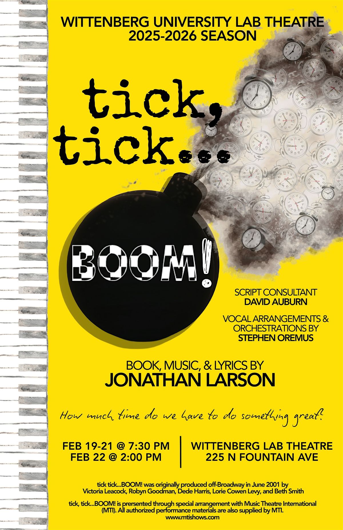 tick, tick...BOOM! is an exciting and heartfelt semi-autobiographical play about a composer and waiter, Jonathan Larson, who describes the anxiety he feels as his 30th birthday is approaching. Jon is feeling an immense amount of pressure because he wants to write the next big successful musical as he feels like he’s running out of time. Meanwhile, his dancer girlfriend Susan is longing for a simpler life outside of NYC. His best friend, Michael, despite also wanting a career in theatre arts, pursues a more practical approach and gets a job as a market research executive. Come join us at The Student Lab Theatre to see this moving story about dreams, struggles, and time!