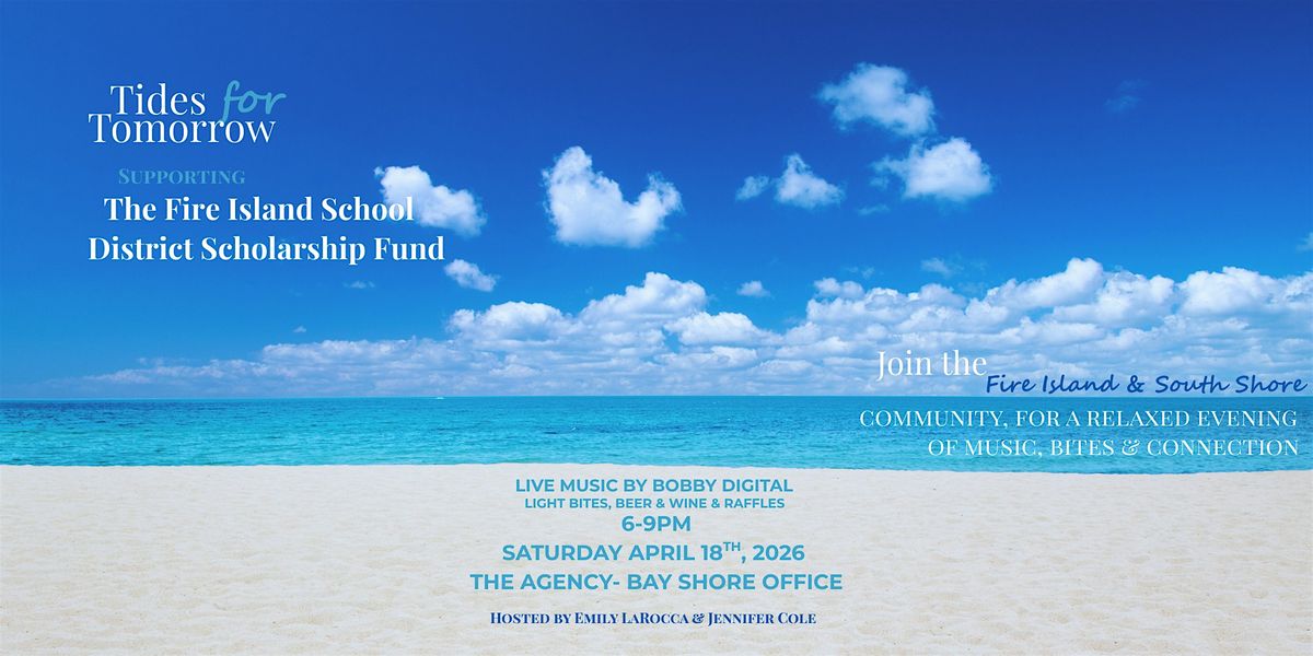 Join us for Tides for Tomorrow, a laid-back evening bringing the Fire Island & South Shore community together in support of the Fire Island School District Scholarship Fund. Enjoy beer and wine, passed light bites, live music by Bobby Digital, and exciting raffles throughout the night as we gather with neighbors and friends to celebrate the spirit that makes our island so special. Together, we’ll be raising funds to give one of our local students the opportunity to earn this scholarship and take the next step toward their future. It’s all about community, connection, and giving back — island style. We hope you’ll join us for a night of great vibes and meaningful impact.