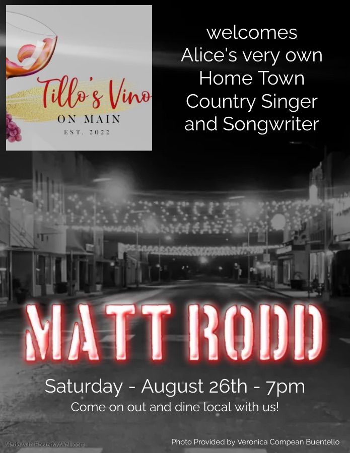 Local venue supporting local entertainer ... this is what the Alice community is all about! A BIG THANK YOU to Tillo's Vino for bringing in Matt Rodd to debut his music right before dropping his first EP on music streaming platforms!Come on out and party with us! We'll be waiting on y'all!