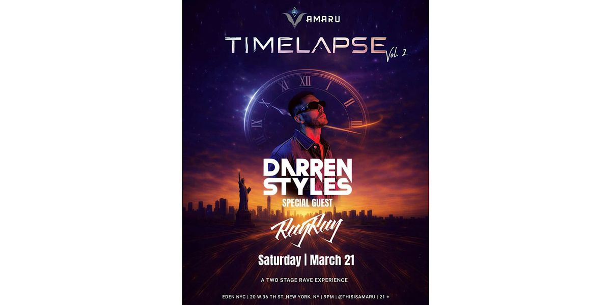 TIMELAPSE takes over Eden NYC on March 21 with the long awaited return of Darren Styles, joined by Taiwanese force DJ RayRay, bringing a high intensity fusion of hard dance and hard techno.