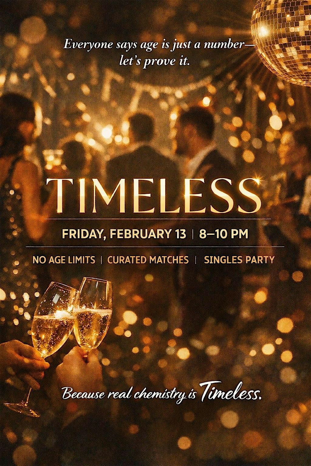 Timeless is our most requested and most expansive singles event yet: an intentionally ageless night designed for real connection across generations. This isn’t about ignoring life stages — it’s about discovering that attraction, curiosity, and chemistry don’t always follow a number.