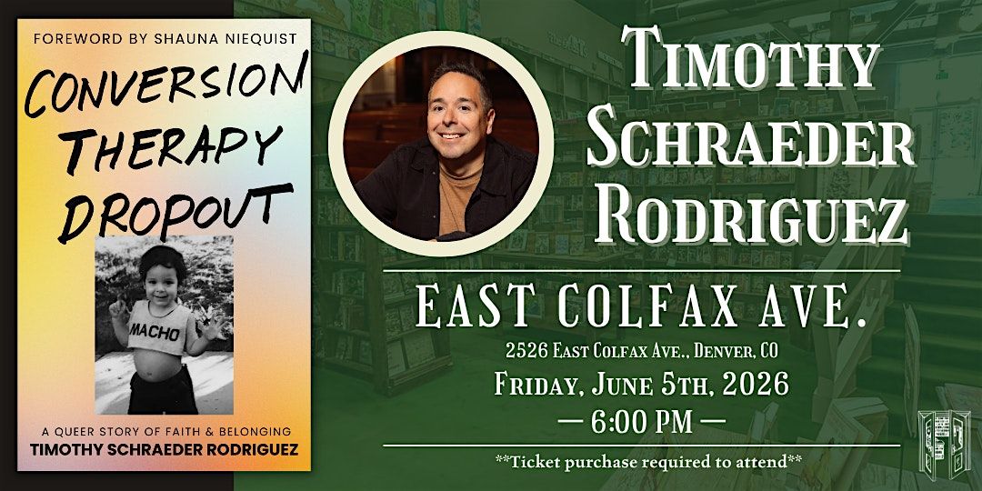 Conversion therapy survivor and former megachurch digital architect Timothy Schraeder Rodriguez is joining us on Friday, June 5th at 6:00 PM at our Colfax location to share about the eight years he spent in conversion therapy while working behind the scenes at some of the most influential evangelical megachurches, and how he stepped away to claim authenticity and wholeness.