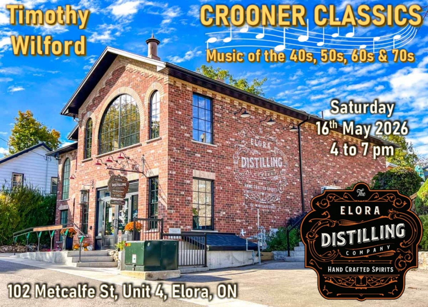 Enjoy dinner and music at the ELORA DISTILLING COMPANY, where Timothy Wilford will be performing Saturday, 16th May 2026, 4-7pm. Hear crooner classics, including the music of Frank Sinatra, Dean Martin, Bobby Darin, Michael Bublé, and many more!